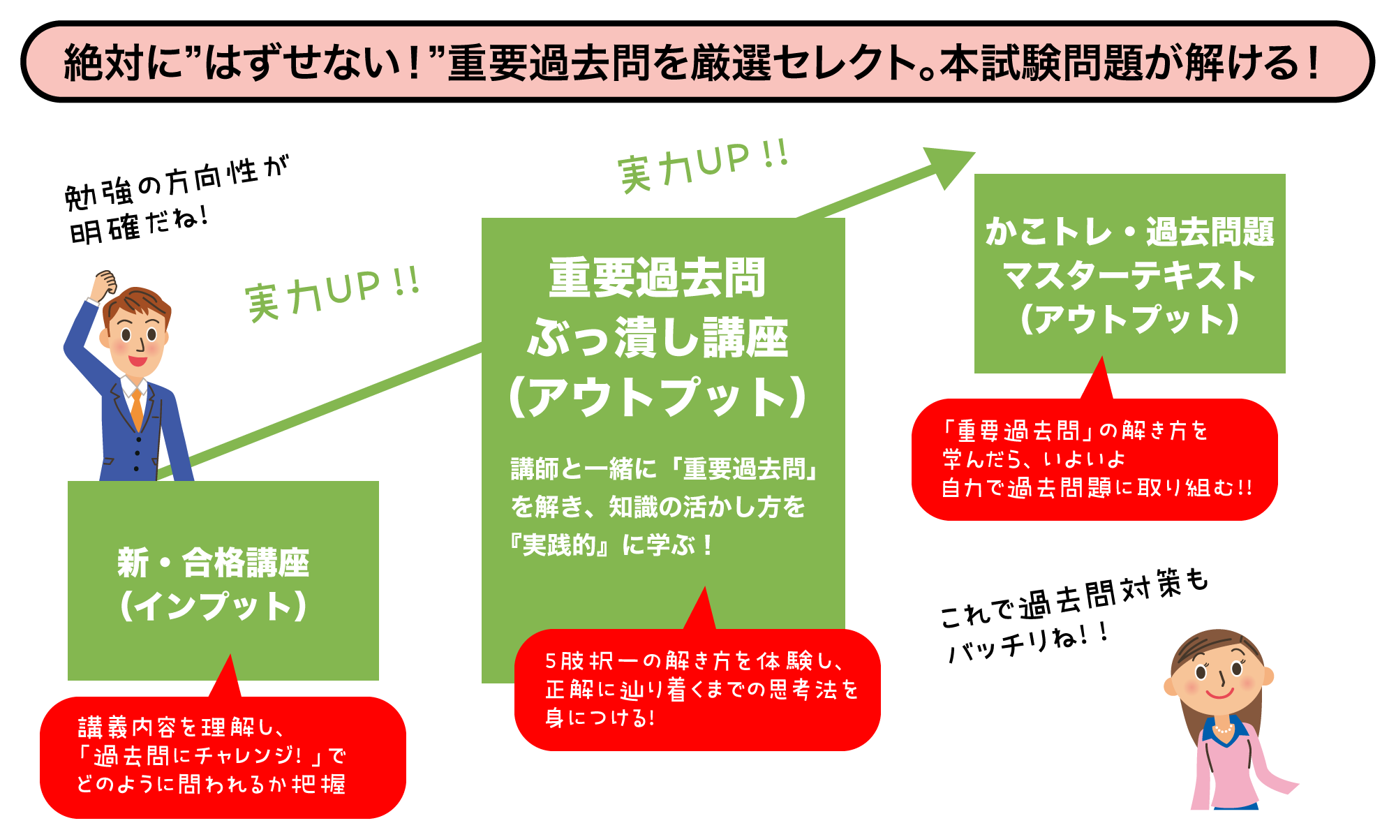 絶対に”はずせない!”重要過去問を厳選セレクト。本試験問題を解ける!が実感できる講座です。