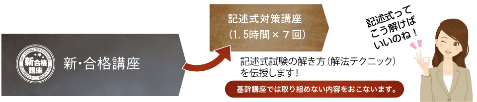 記述式問題といっても、慌てることはありません。記述式問題は、基本的な解き方や体系的な解法テクニックが存在します。その解法テクニックに沿って問題を解くことさえできれば、新・合格講座で学んだ「キーワード」が、そのまま使えます。