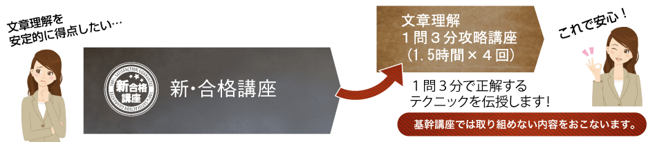 本講座では、講義の中で講師自らが短時間で解くことで、解法テクニック(1問を3分で正解する解法テクニック)を伝授します。これにより、文章理解を本試験の場で安定的に得点できる得意科目へと導きます。
